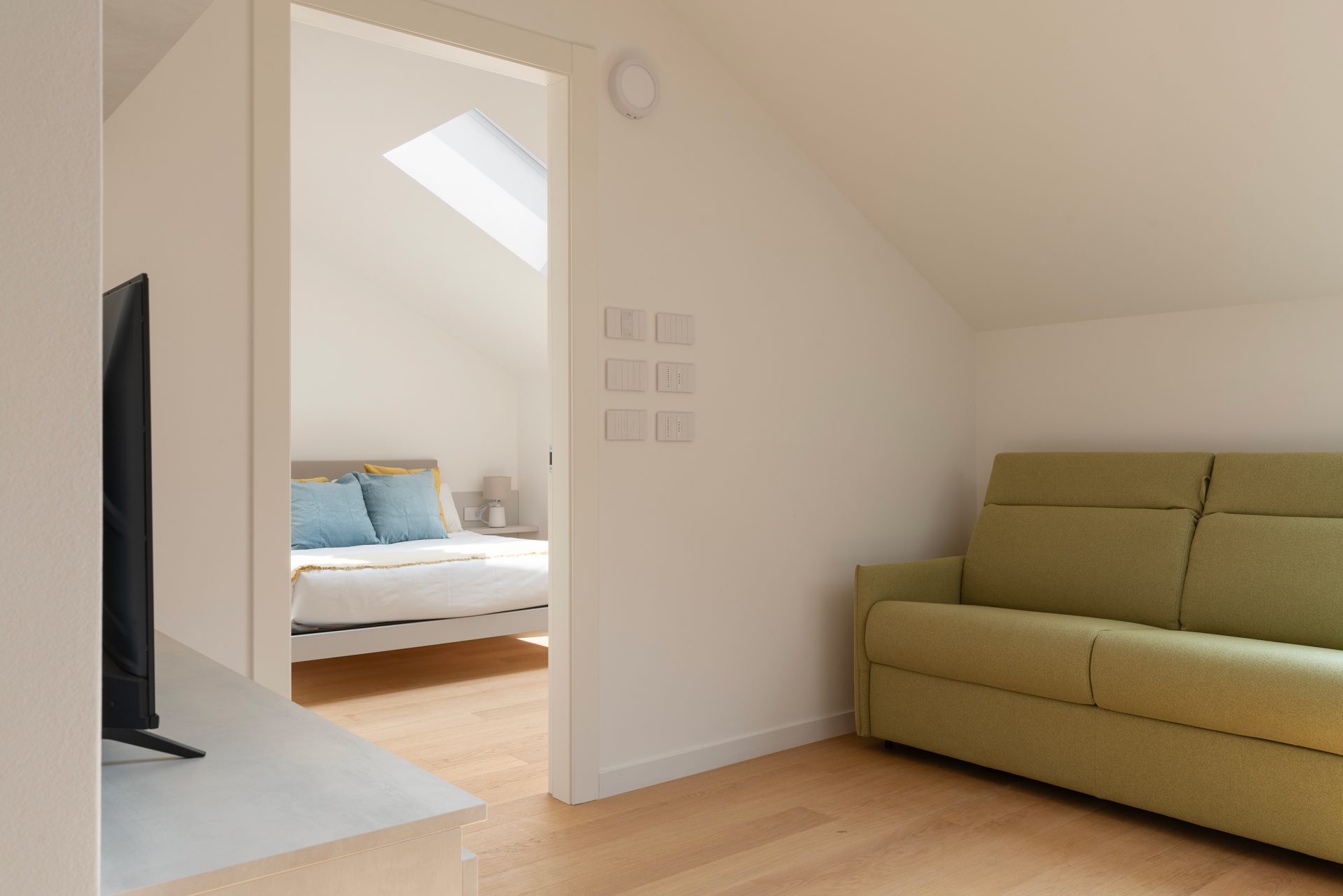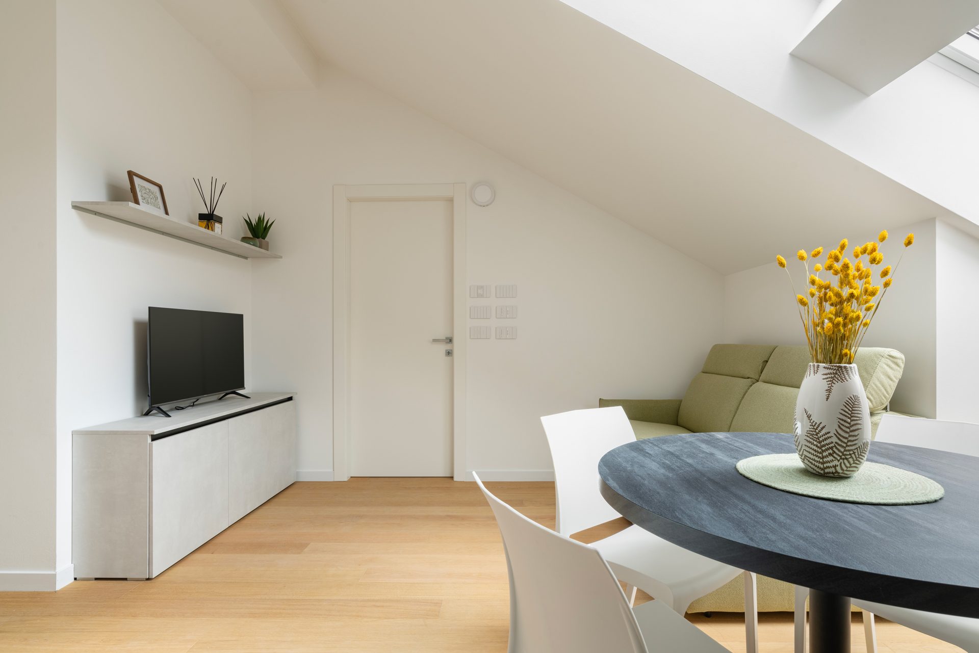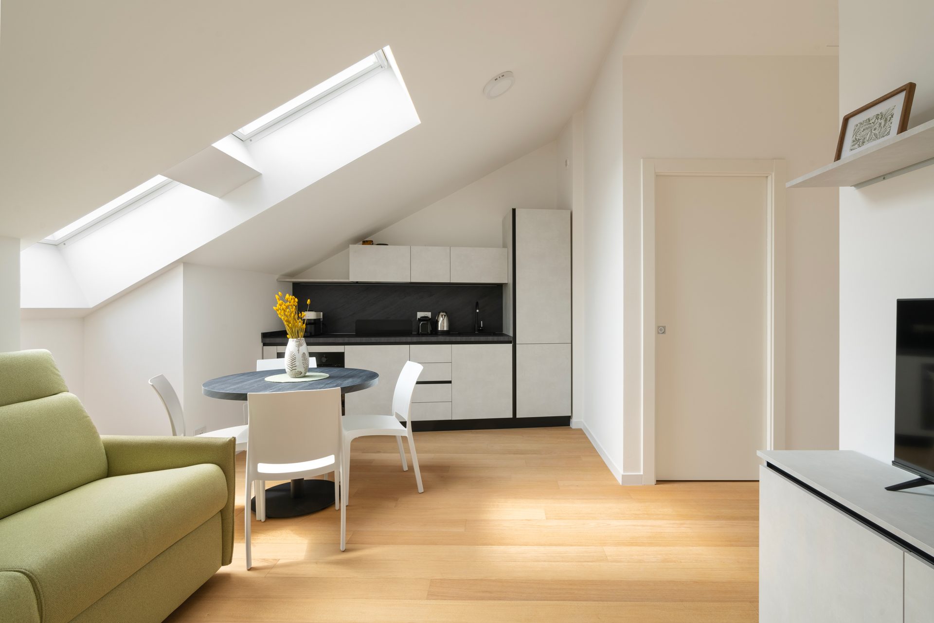 Beautiful attic apartment for four people in a brand new complex of great elegance and uniqueness. Living room with open kitchen and dining table, sofa bed and TV area. Double bedroom with large wardrobe. Bathroom with laundry. The apartment is completely new and furnished with designer furnishings. Equipped with all the comforts and appliances to feel at home.