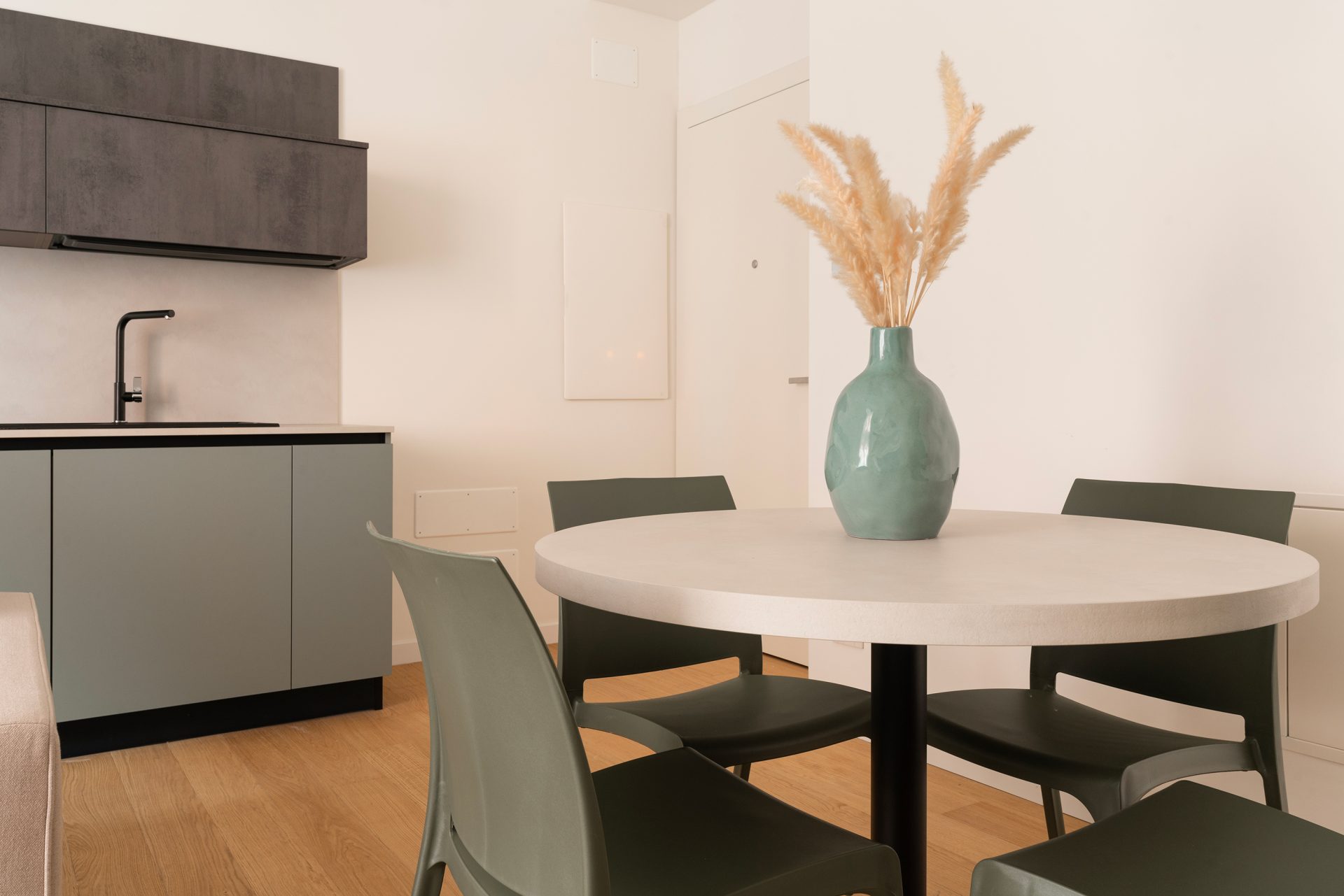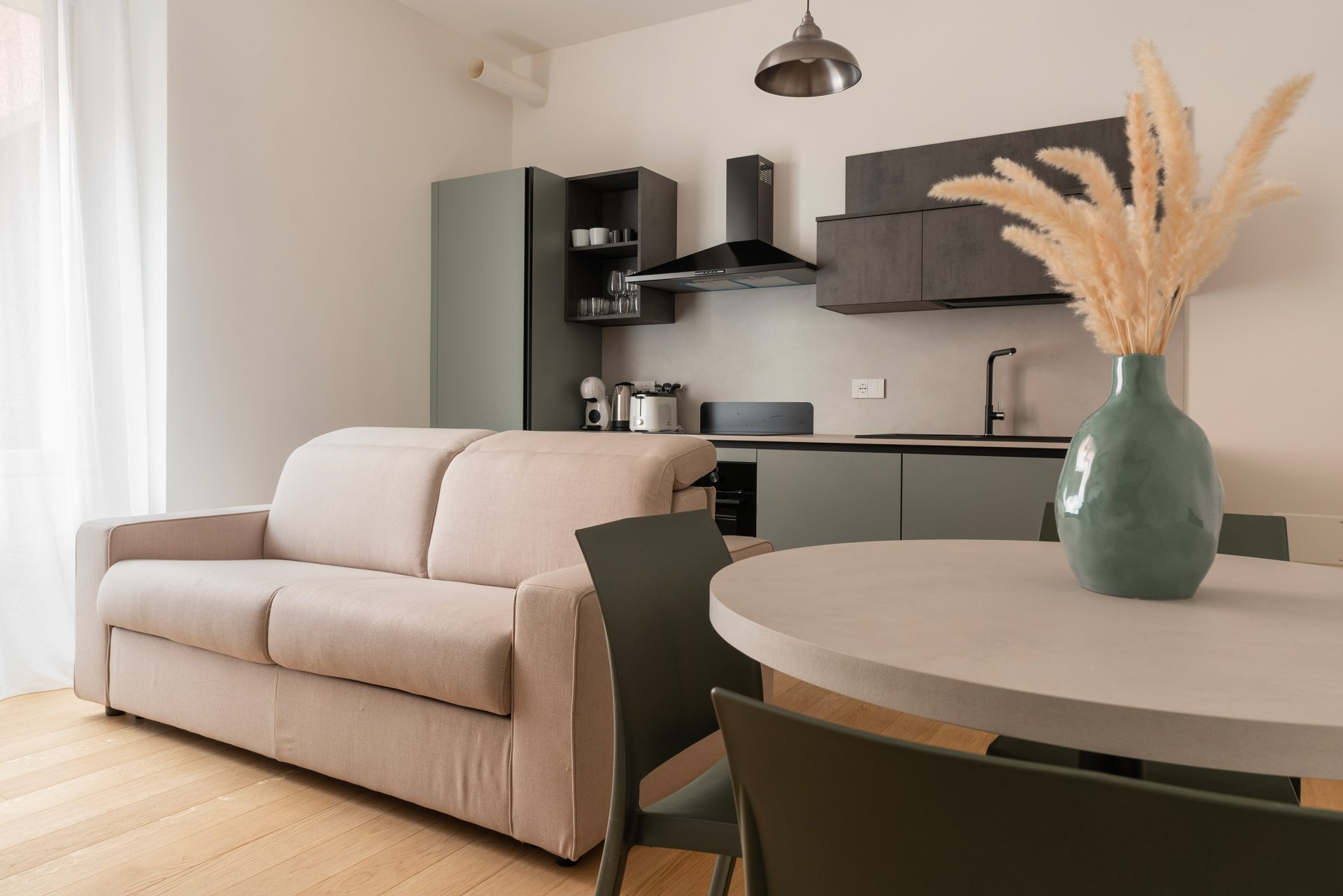 The Residence, in addition to being completely renovated, offers exclusive services such as a gym and co-working offices. The apartment, on the second floor, consists of an entrance directly into the living area with an open kitchen, a large bedroom with direct access to the garden and a bathroom with shower. The apartment is tastefully furnished and equipped with all the appliances necessary for living. Available immediately.